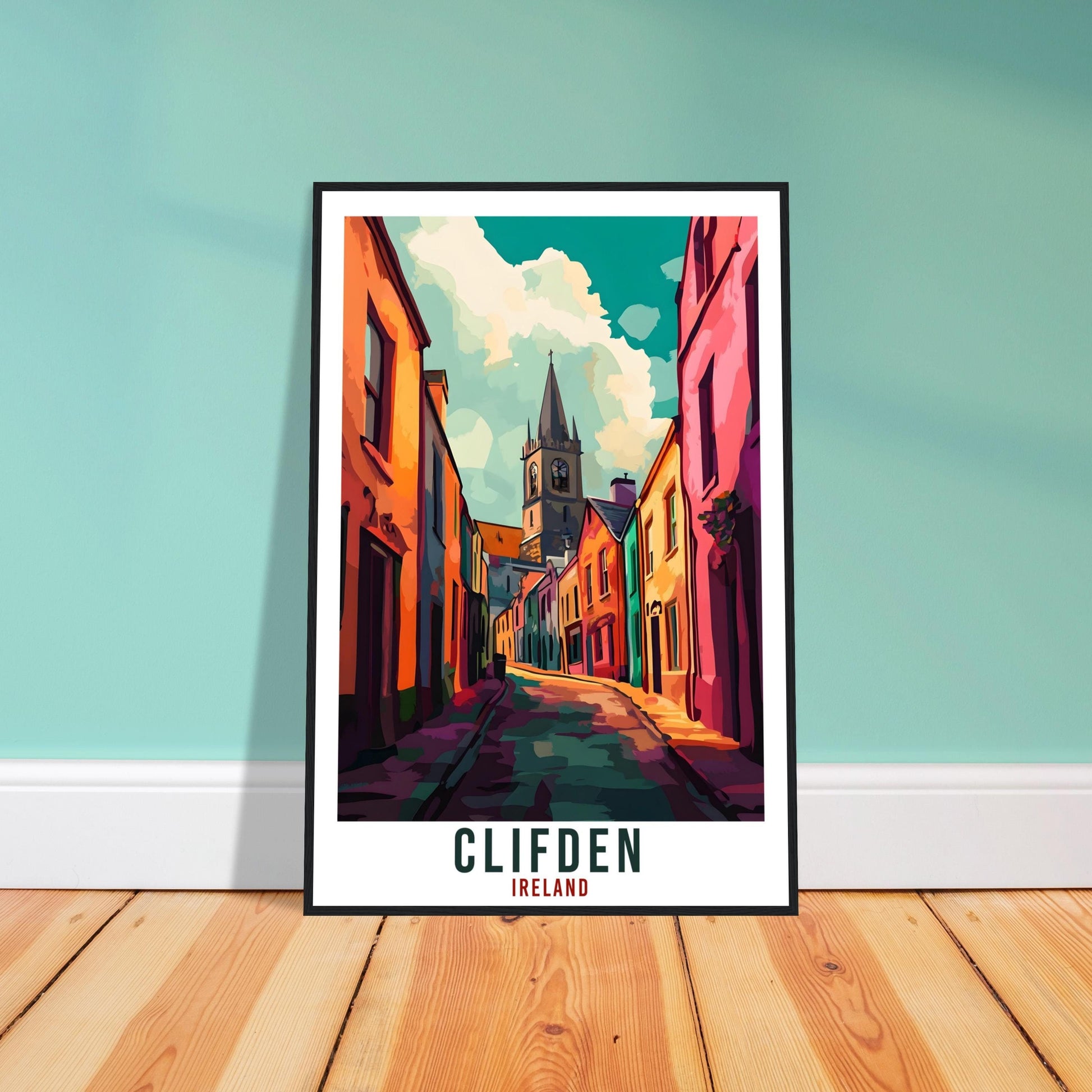 Transport yourself back to Clifden, County Galway, Ireland. Whether you lived there, visited there or are from there, travel back with this Clifden travel poster. Visit the sounds, smells, tastes, colors and culture every time you look at your new travel print. Each design is an imaginative recreation of the area to illicit memories of travelling there.