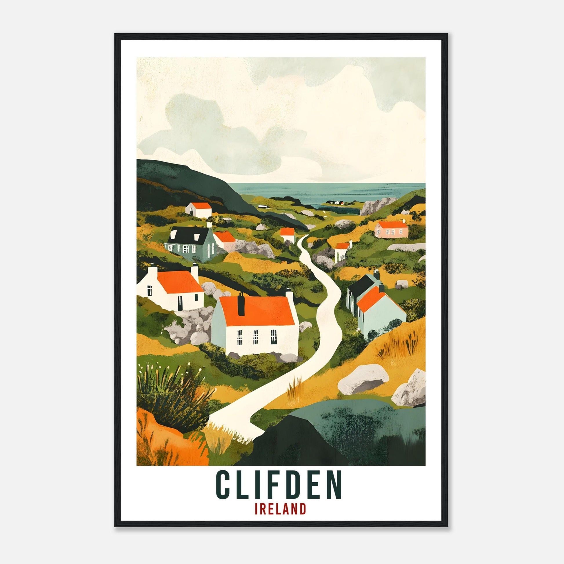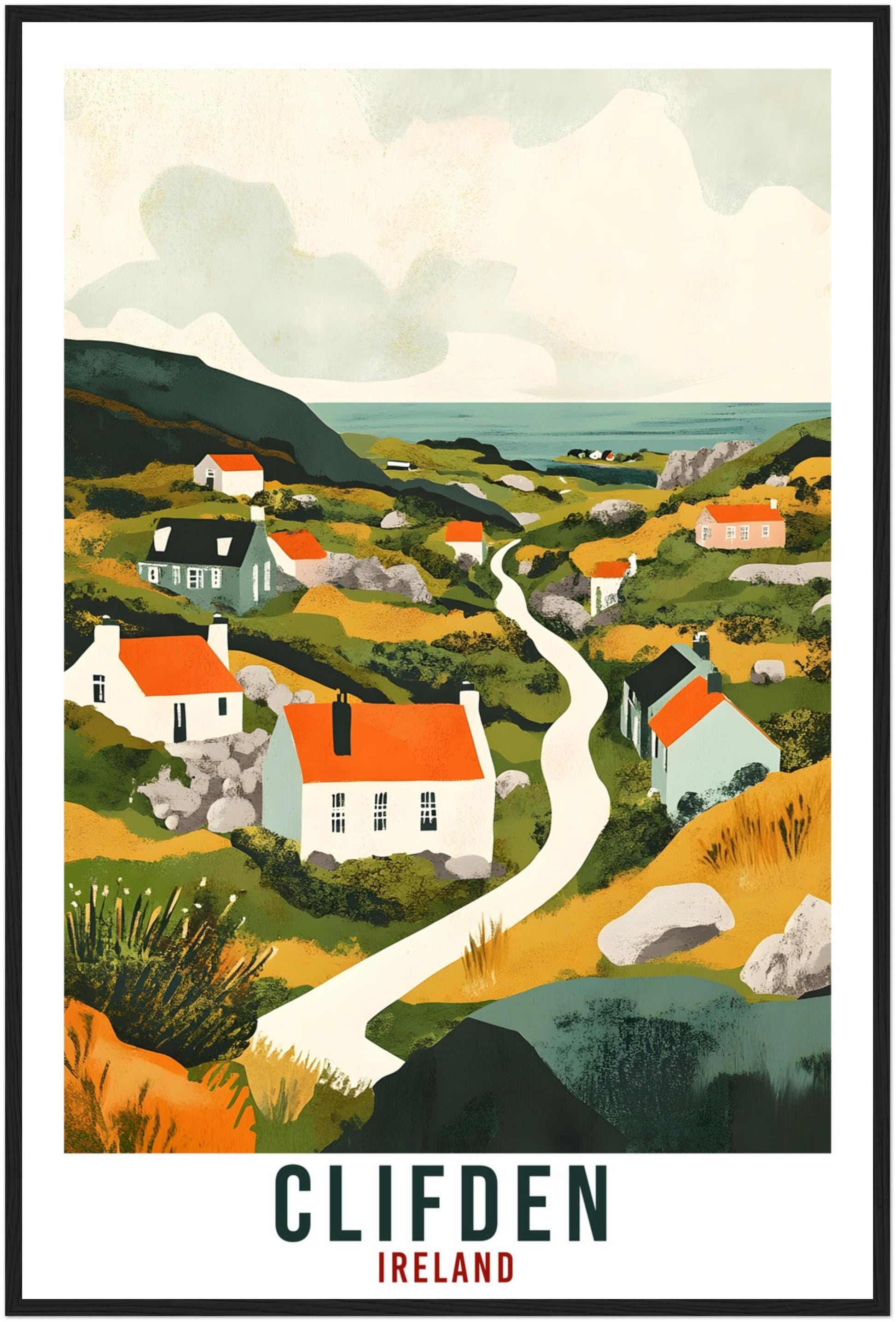 Transport yourself back to Clifden, County Galway, Ireland. Whether you lived there, visited there or are from there, travel back with this Clifden travel poster. Visit the sounds, smells, tastes, colors and culture every time you look at your new travel print. Each design is an imaginative recreation of the area to illicit memories of travelling there.