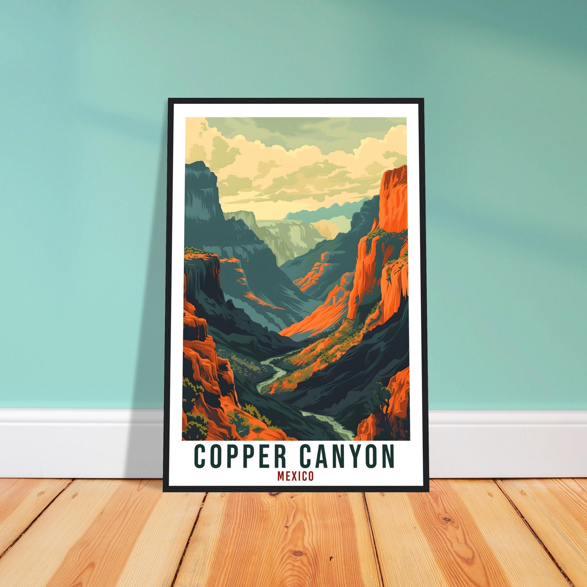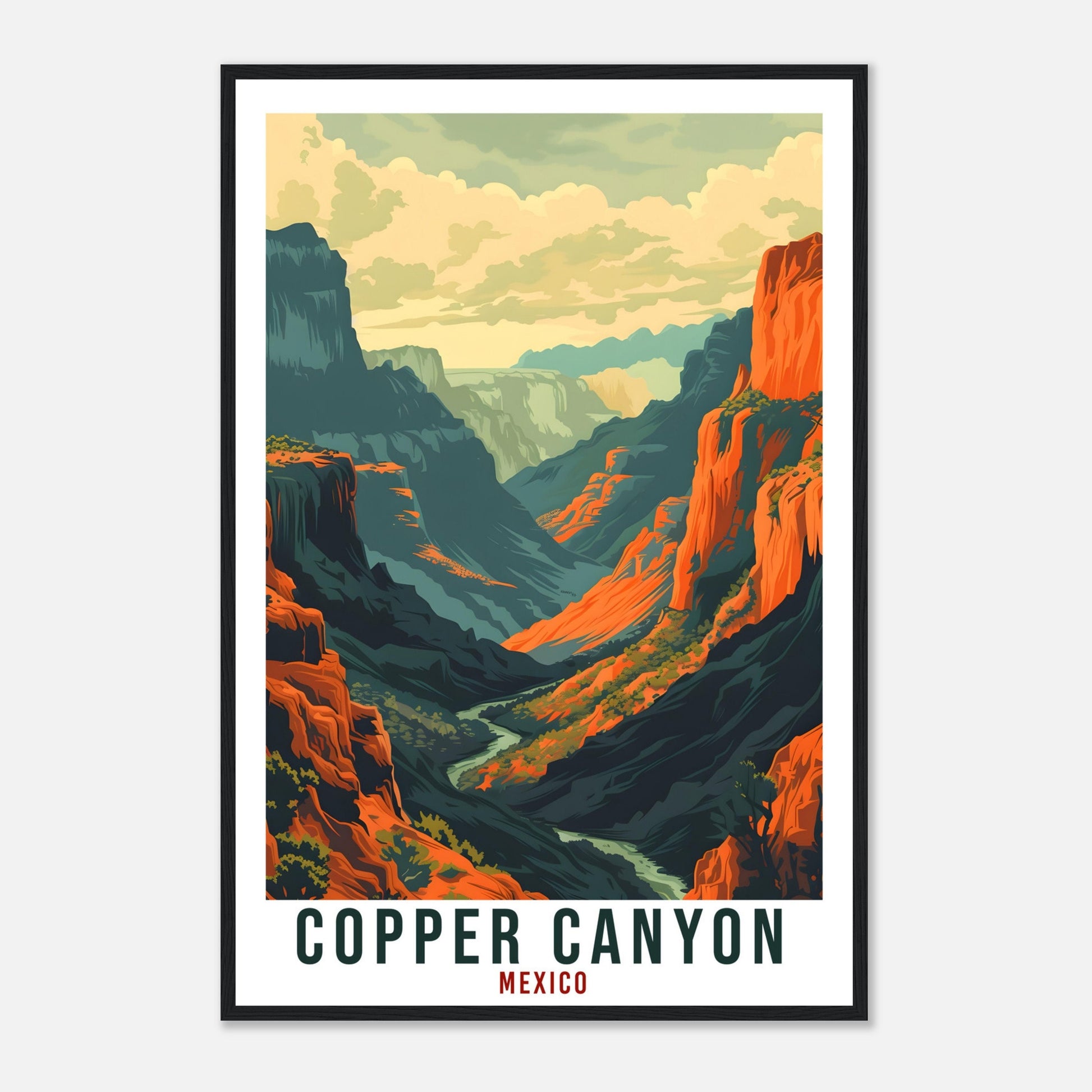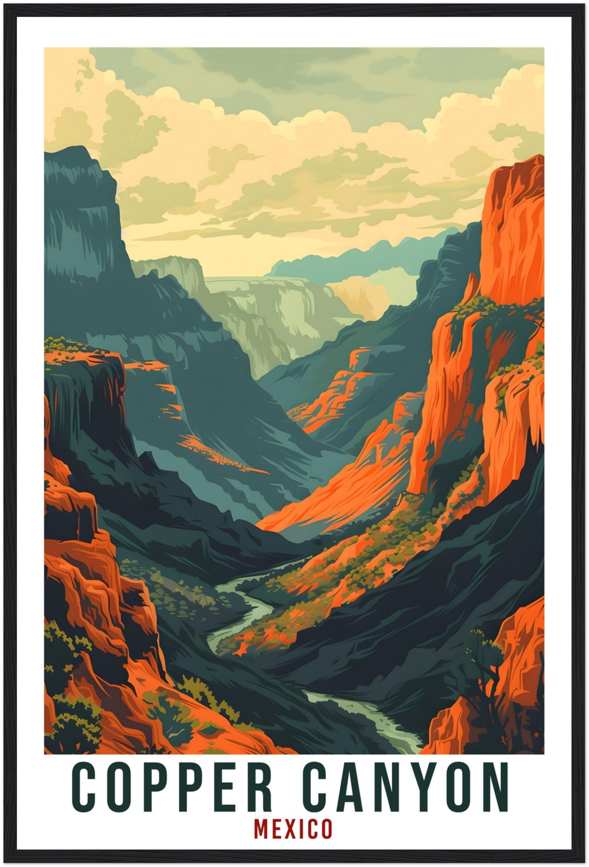 Transport yourself back to Copper Canyon, Mexico. Whether you lived there, visited there or are from there, travel back with this Copper Canyon travel poster. Visit the sounds, smells, tastes, colors and culture every time you look at your new travel print. Each design is an imaginative recreation of the area to illicit memories of travelling there.