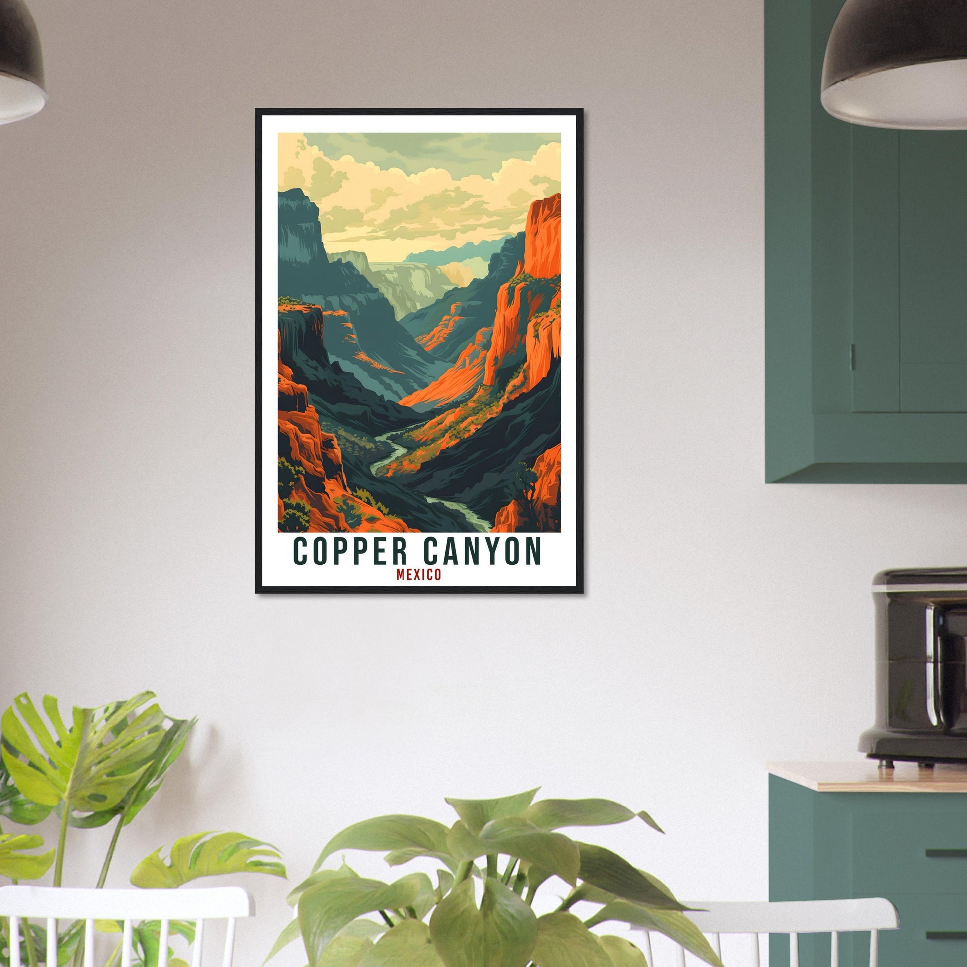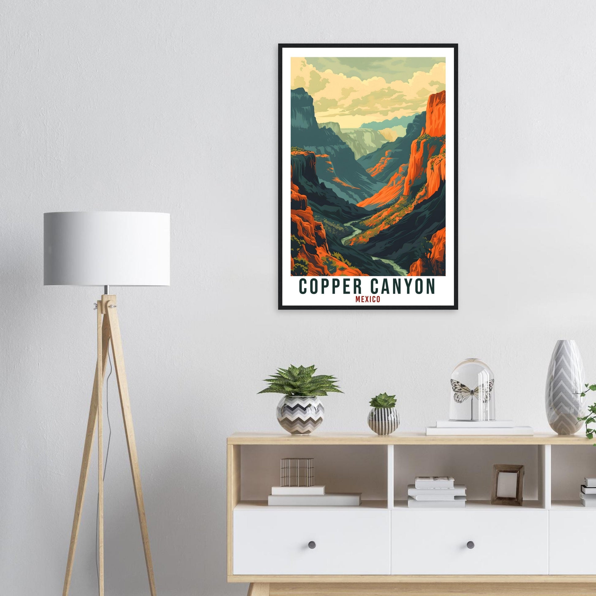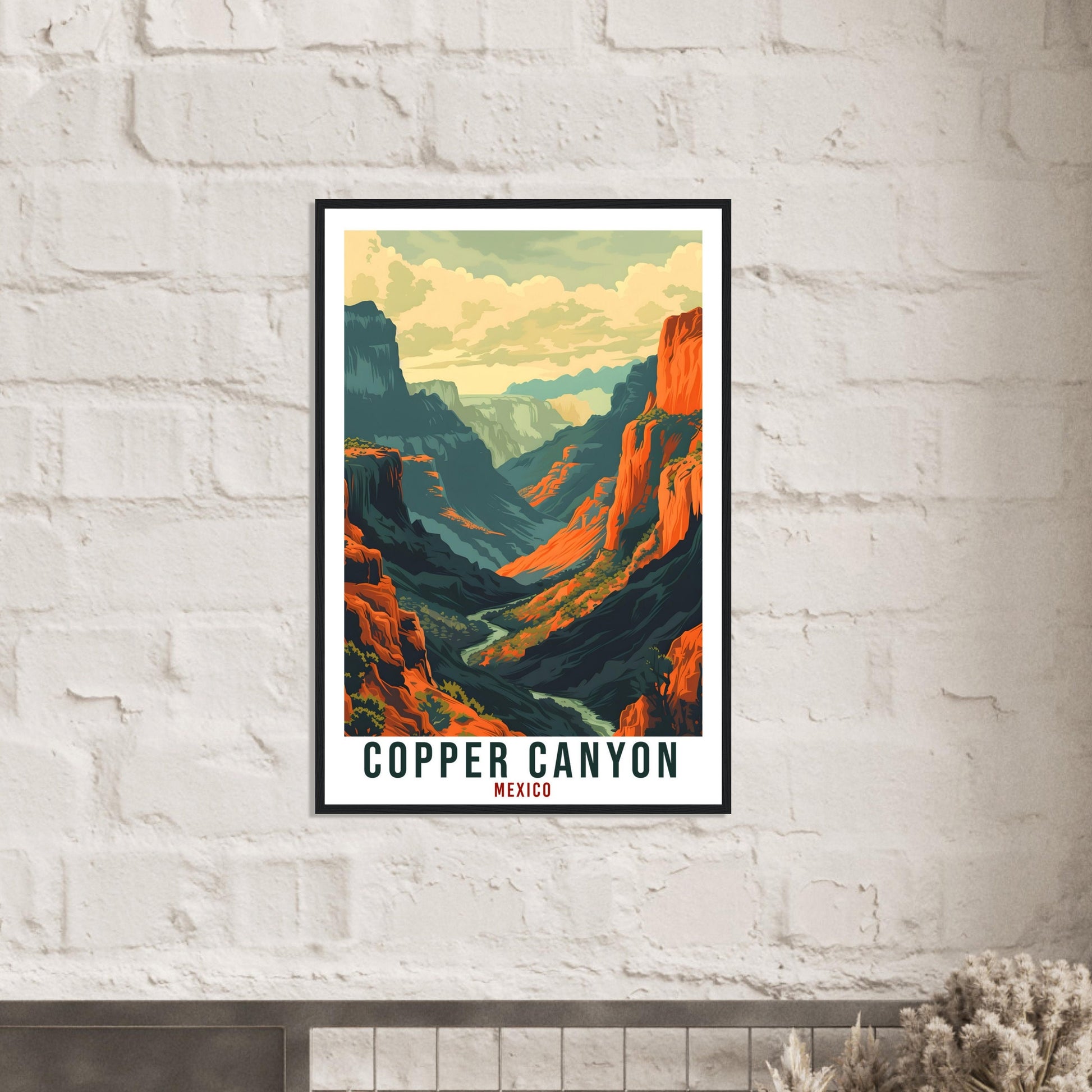 Transport yourself back to Copper Canyon, Mexico. Whether you lived there, visited there or are from there, travel back with this Copper Canyon travel poster. Visit the sounds, smells, tastes, colors and culture every time you look at your new travel print. Each design is an imaginative recreation of the area to illicit memories of travelling there.