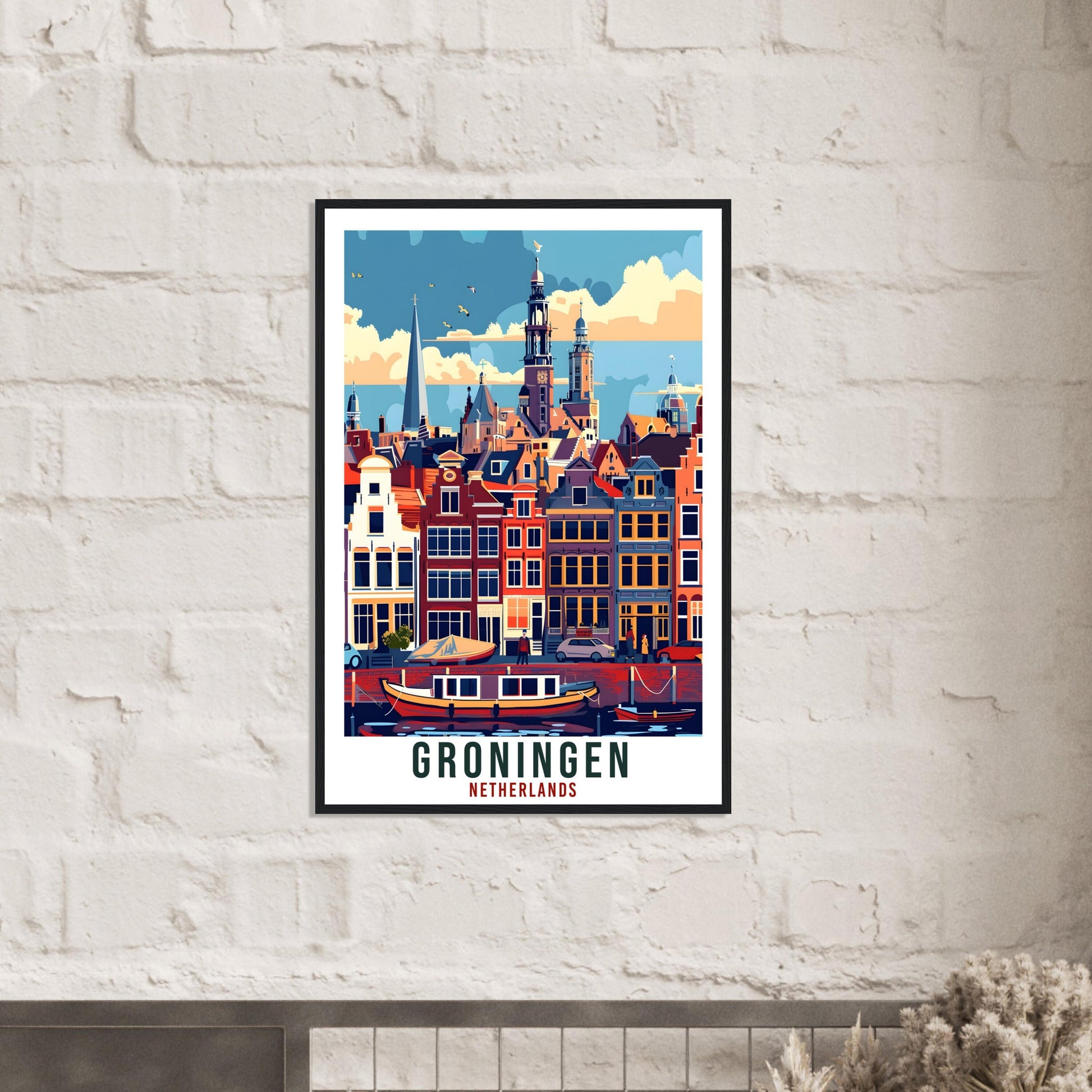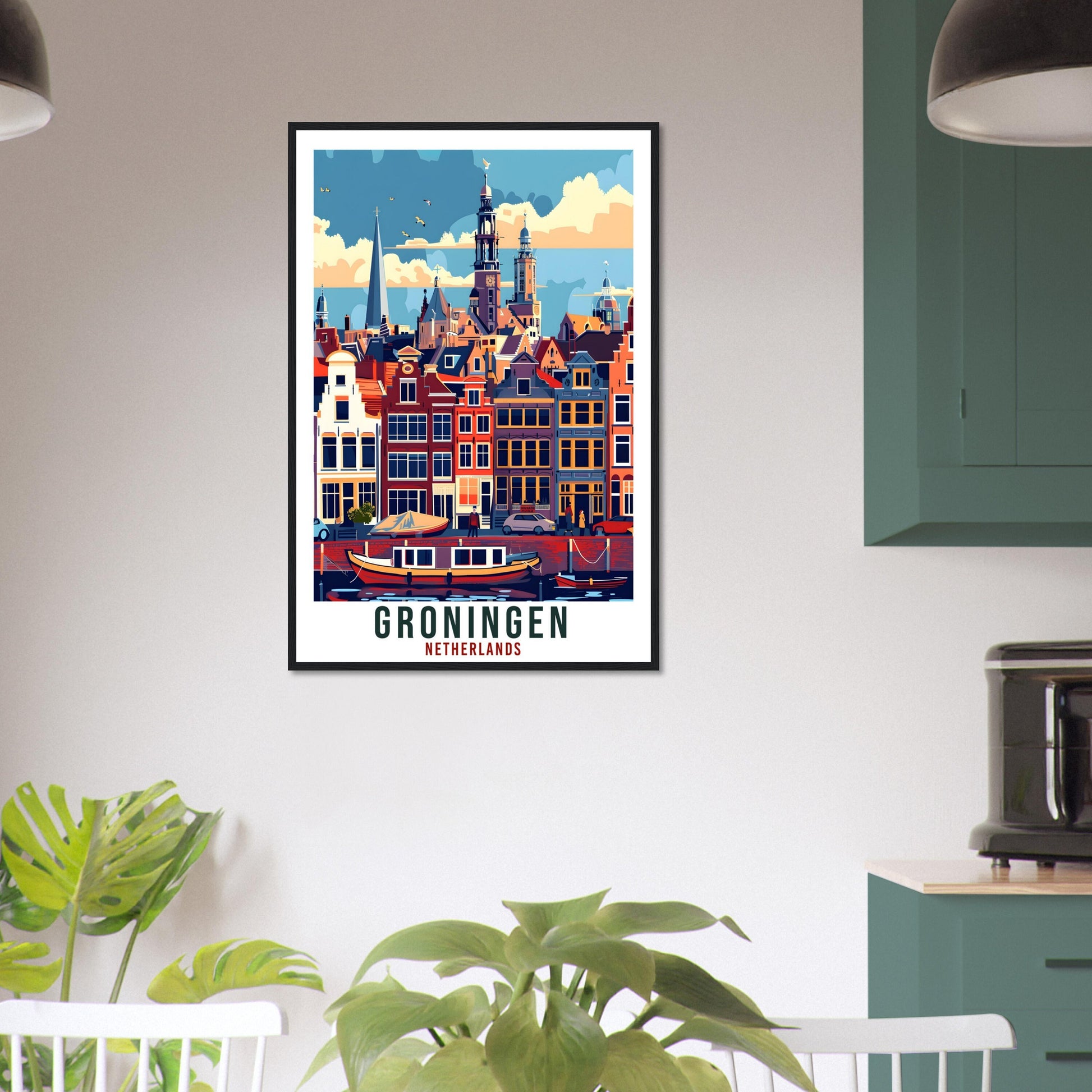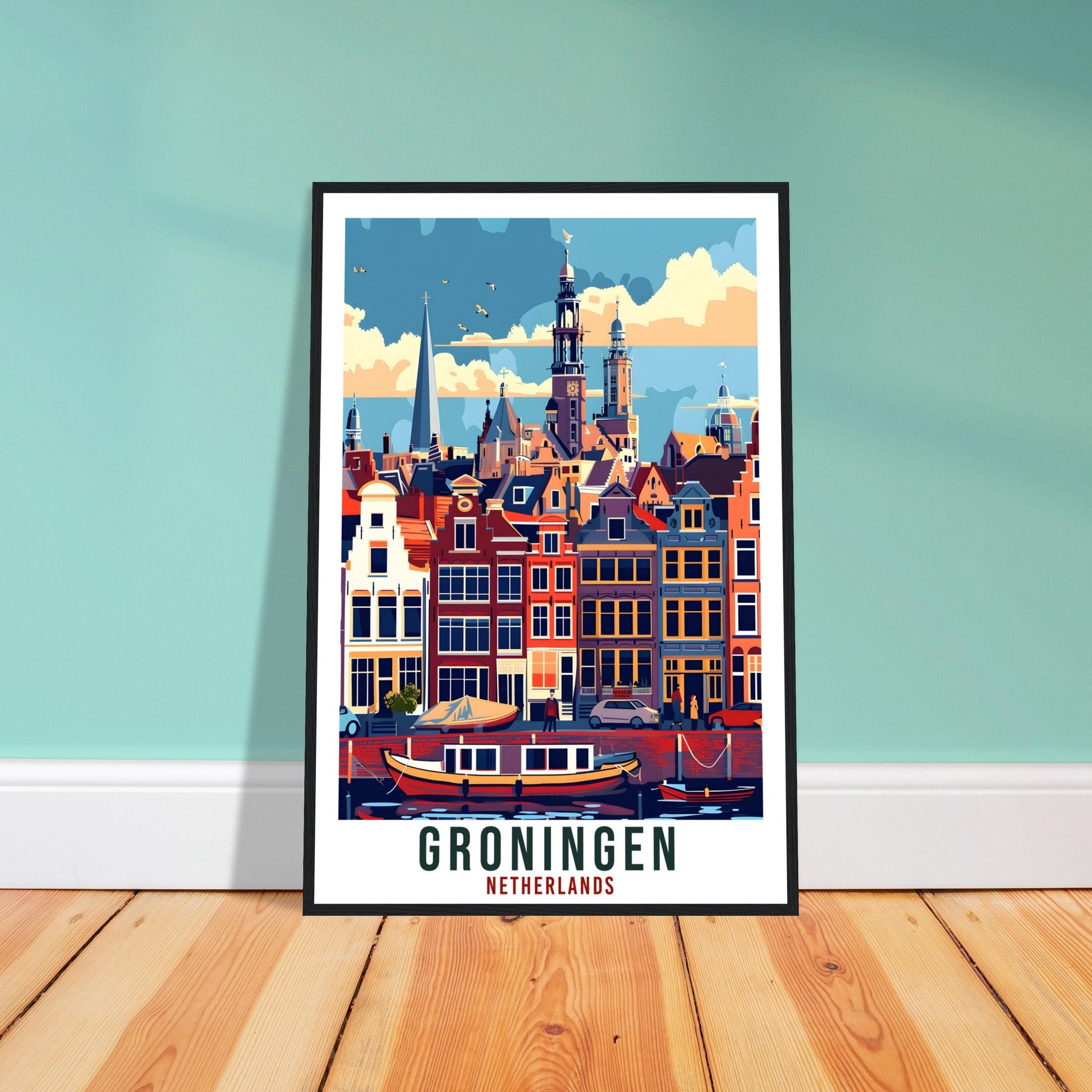 Transport yourself back to Groningen, Netherlands. Whether you lived there, visited there or are from there, travel back with this Groningen travel poster. Visit the sounds, smells, tastes, colors and culture every time you look at your new travel print.