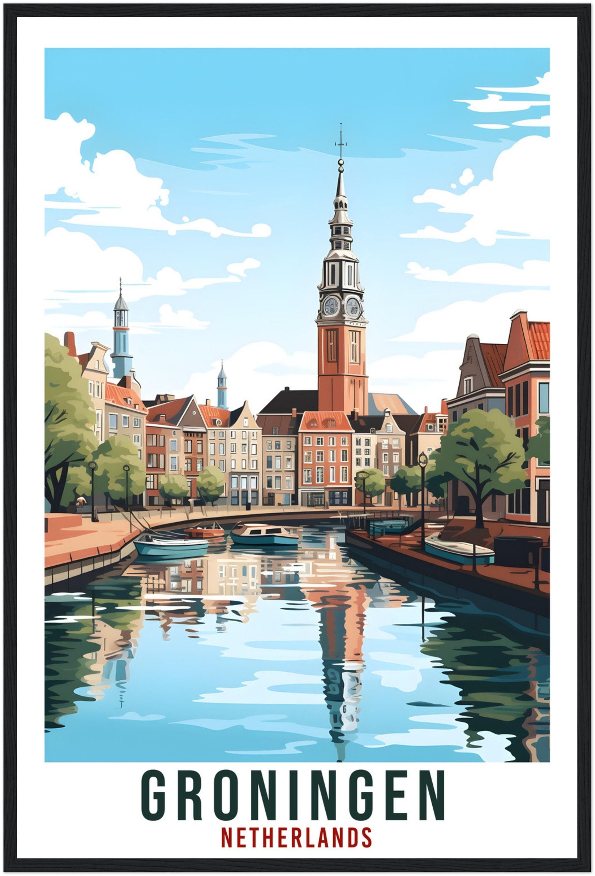 Transport yourself back to Groningen, Netherlands. Whether you lived there, visited there or are from there, travel back with this Groningen travel poster. Visit the sounds, smells, tastes, colors and culture every time you look at your new travel print.