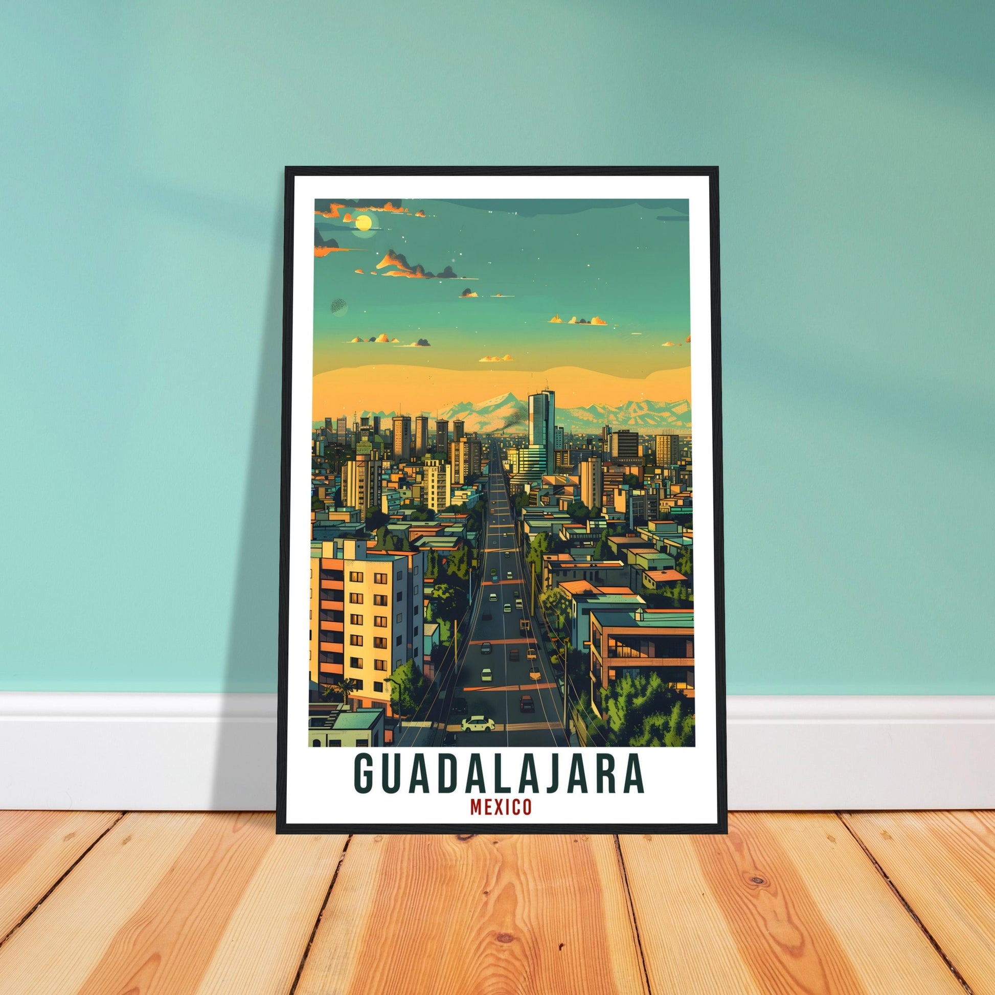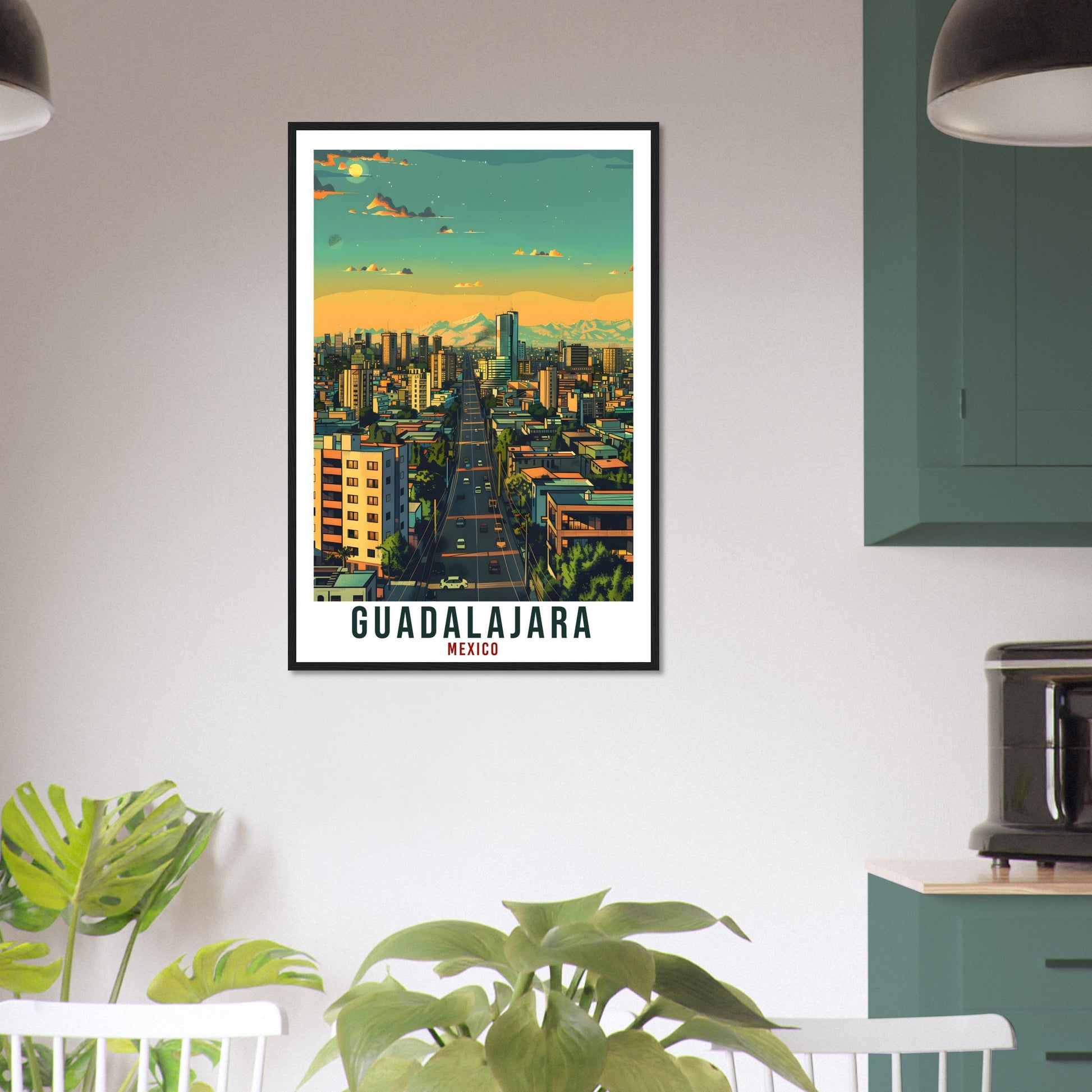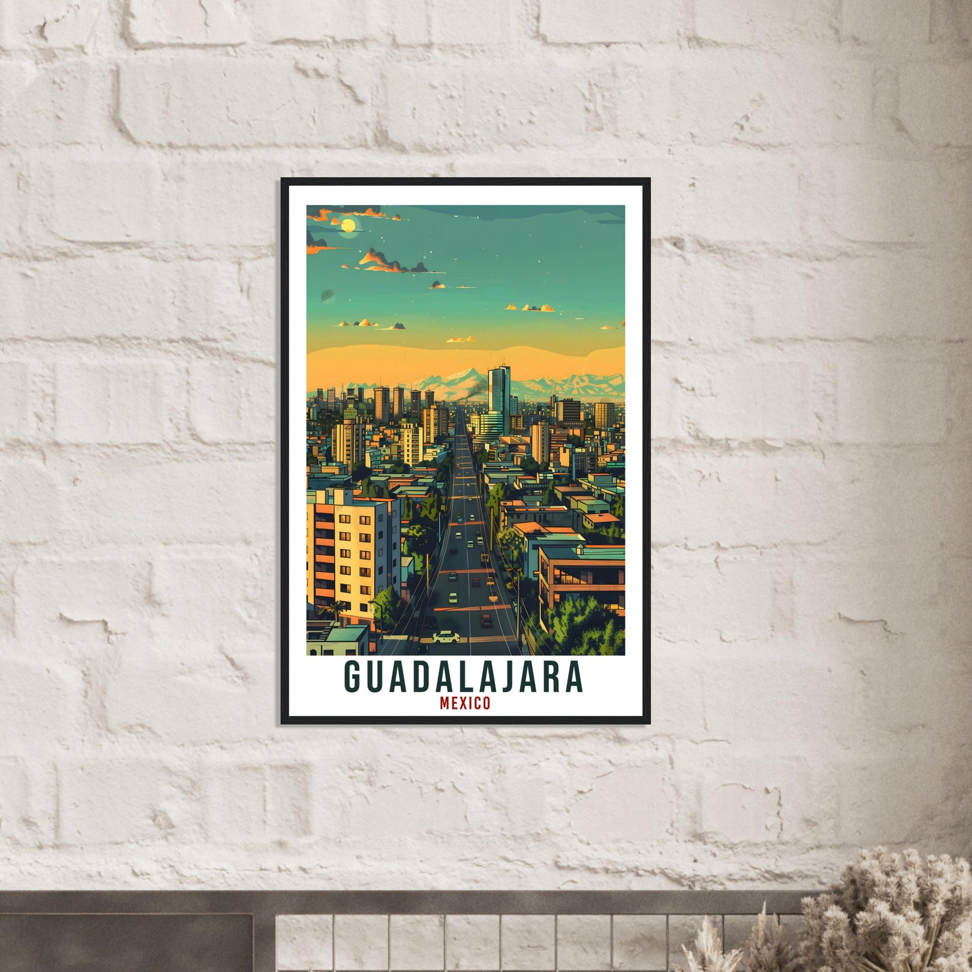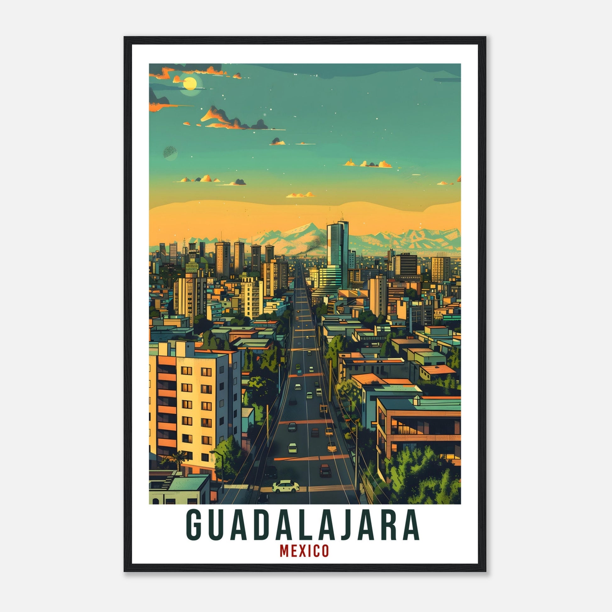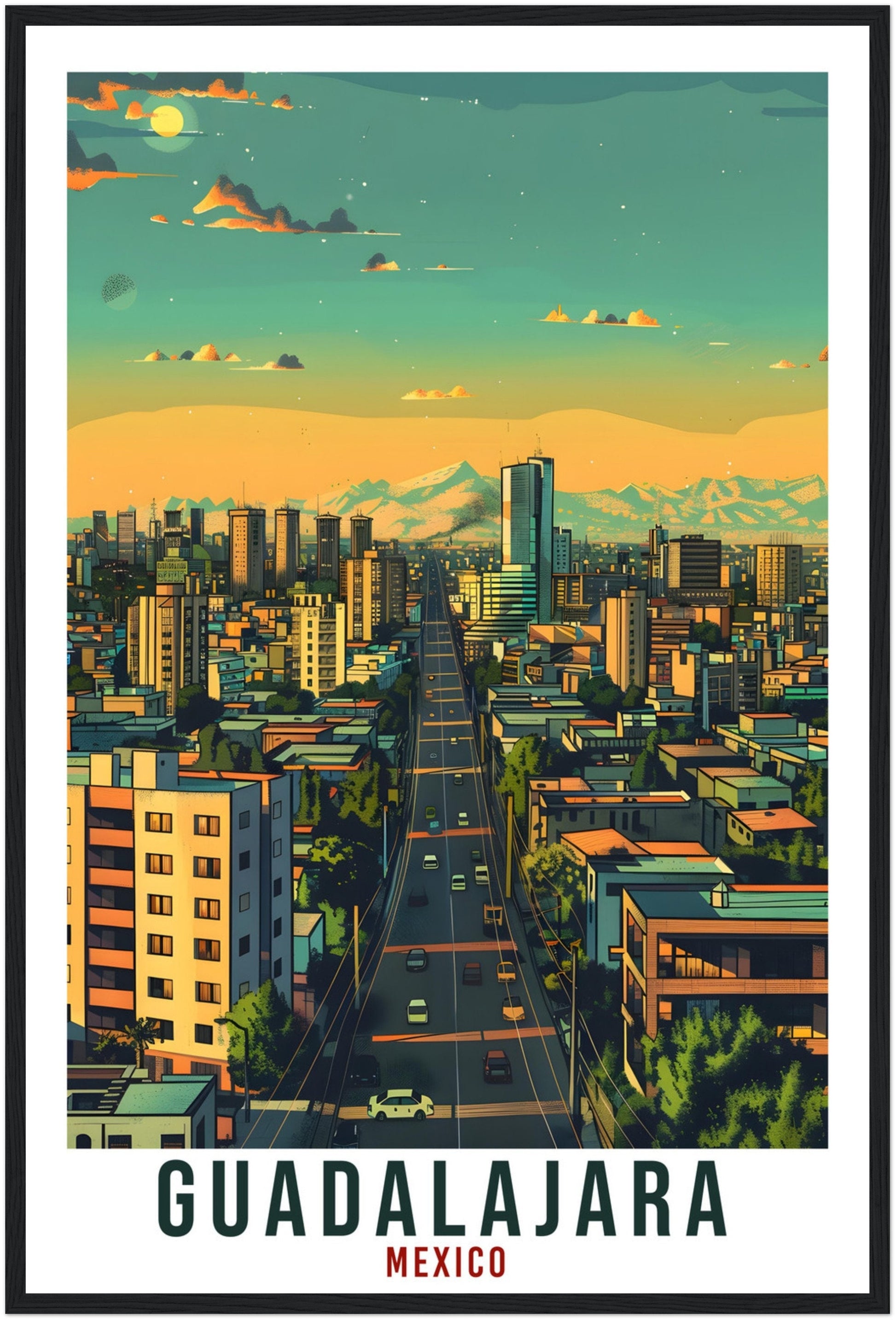Transport yourself back to Guadalajara, Mexico. Whether you lived there, visited there or are from there, travel back with this Guadalajara travel poster. Visit the sounds, smells, tastes, colors and culture every time you look at your new travel print. Each design is an imaginative recreation of the area to illicit memories of travelling there.