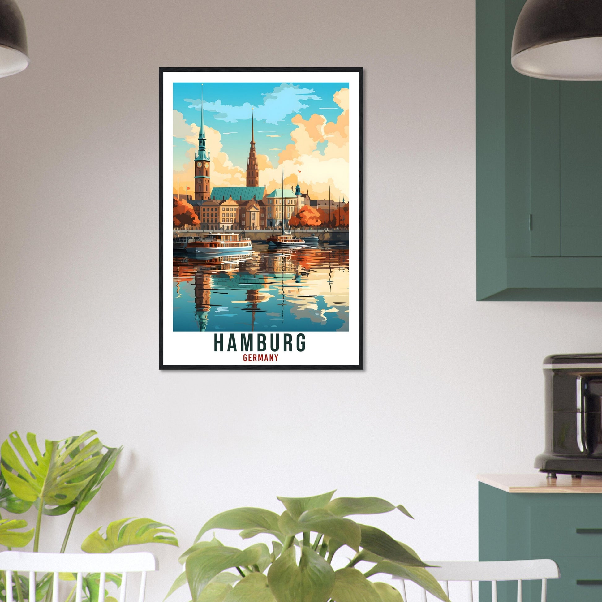 Transport yourself back to Hamburg, Germany. Whether you lived there, visited there or are from there, travel back with this Hamburg travel poster. Visit the sounds, smells, tastes, colors and culture every time you look at your new travel print.