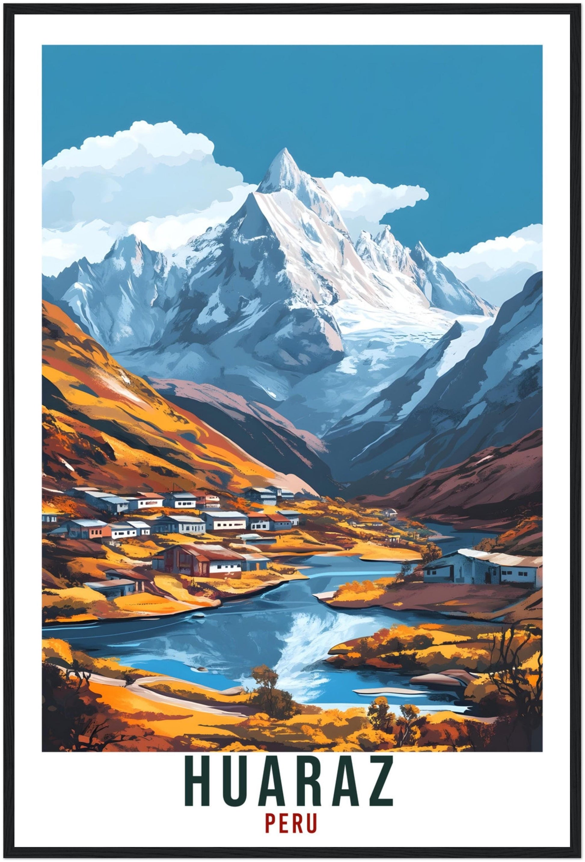 Transport yourself back to Huaraz, Peru. Whether you lived there, visited there or are from there, travel back with this Huaraz travel poster. Visit the sounds, smells, tastes, colors and culture every time you look at your new travel print. Each design is an imaginative recreation of the area to illicit memories of travelling there.