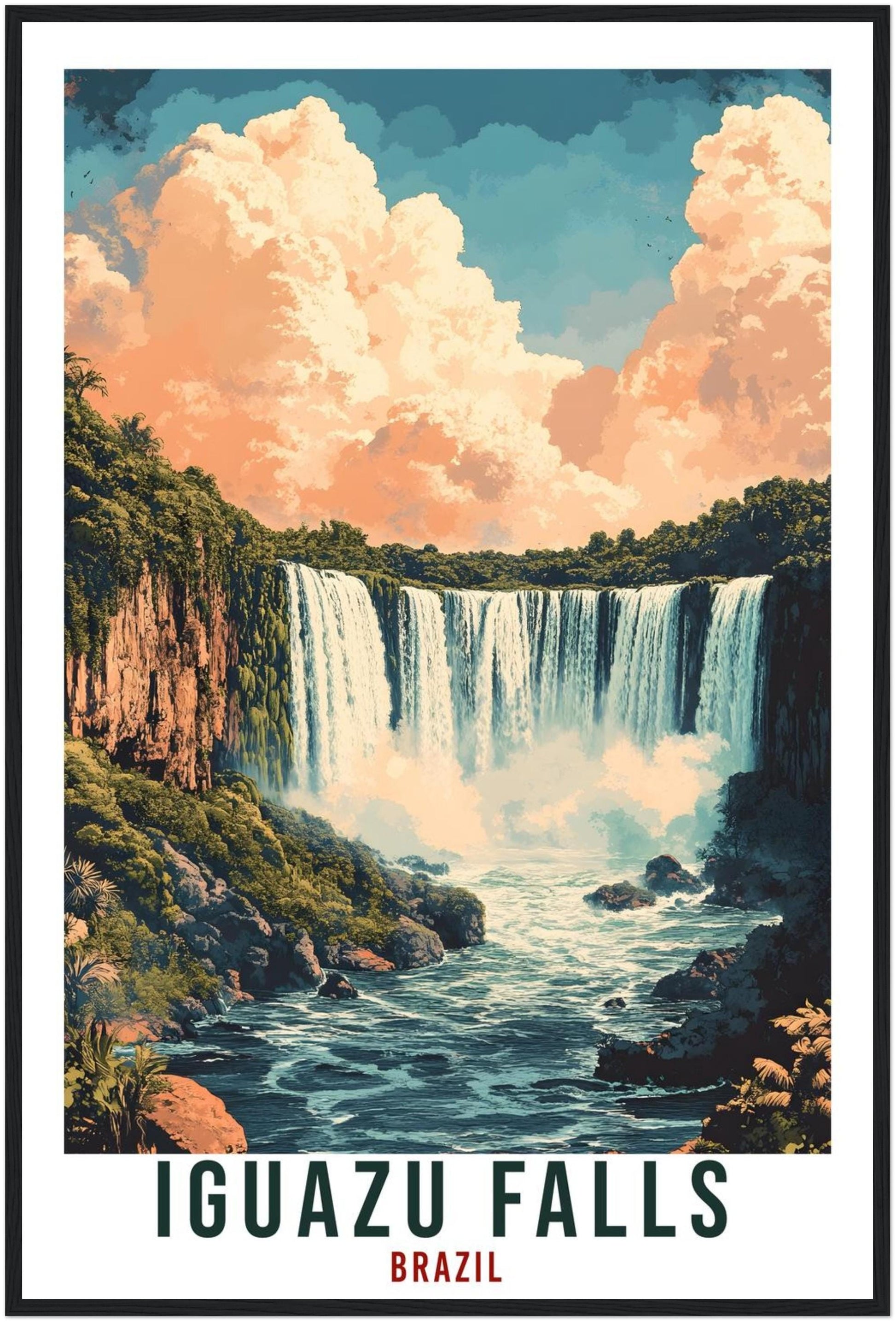 Transport yourself back to Iguazu Falls, Brazil. Whether you lived there, visited there or are from there, travel back with this Iguazu Falls National Park travel poster. Visit the sounds, smells, tastes, colors and culture every time you look at your new travel print. Each design is an imaginative recreation of the area to illicit memories of travelling there.
