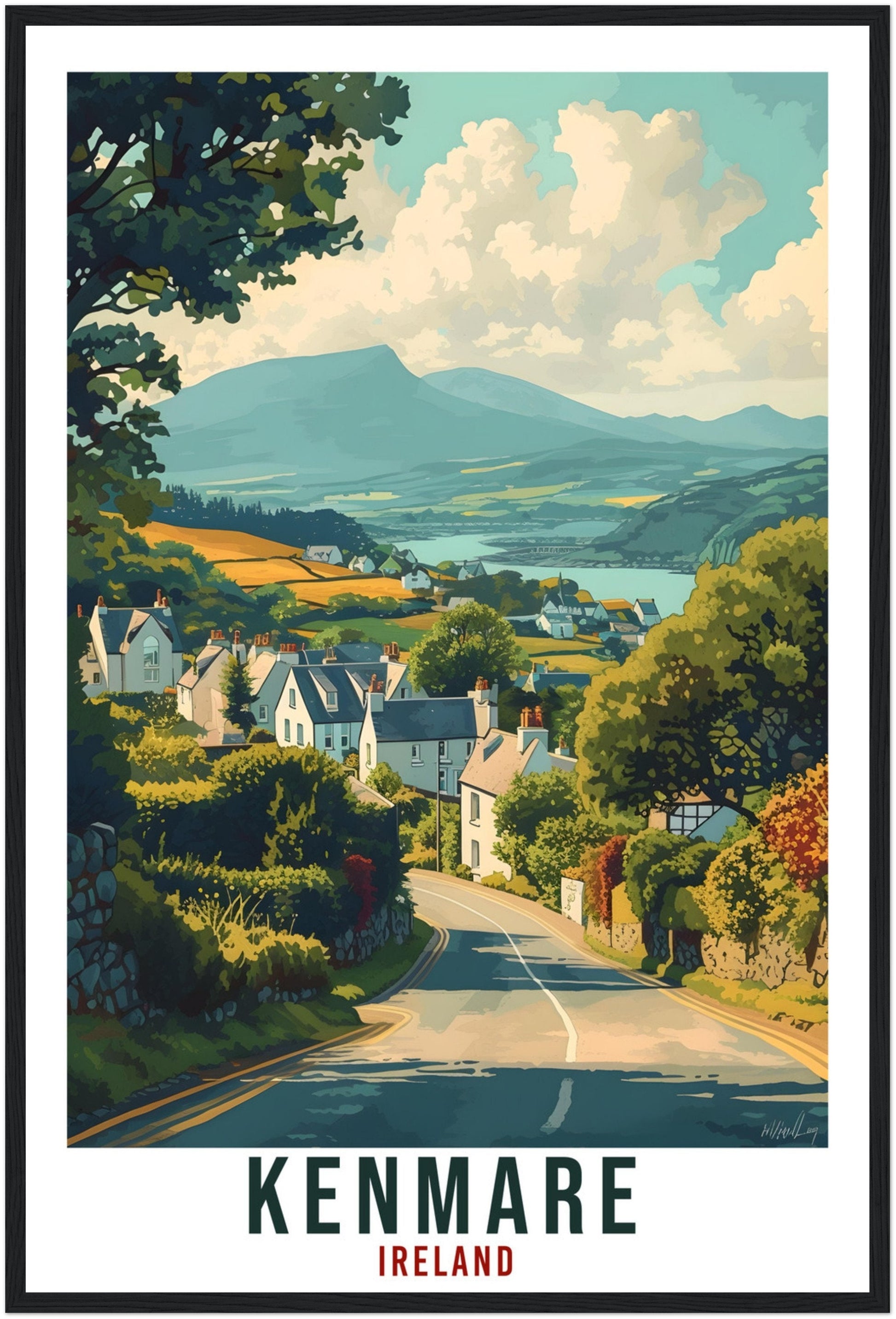 Transport yourself back to Kenmare, Ireland. Whether you lived there, visited there or are from there, travel back with this Kenmare travel poster. Visit the sounds, smells, tastes, colors and culture every time you look at your new travel print.