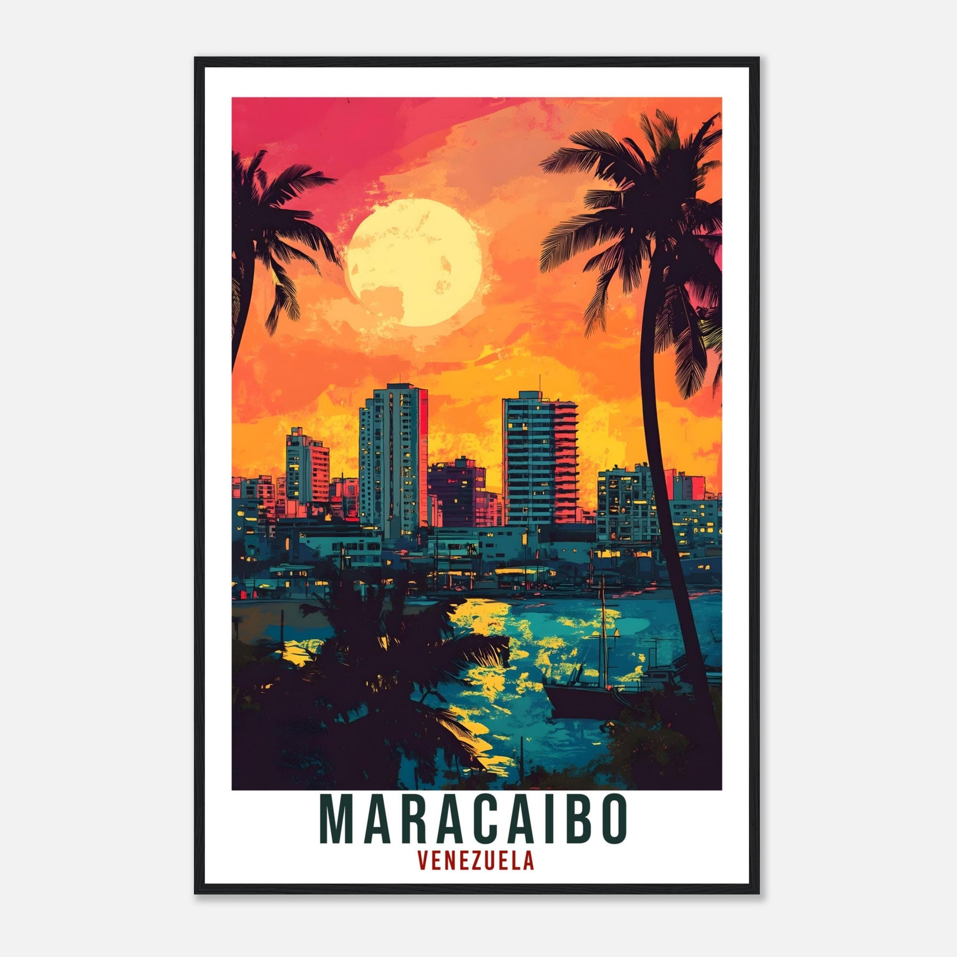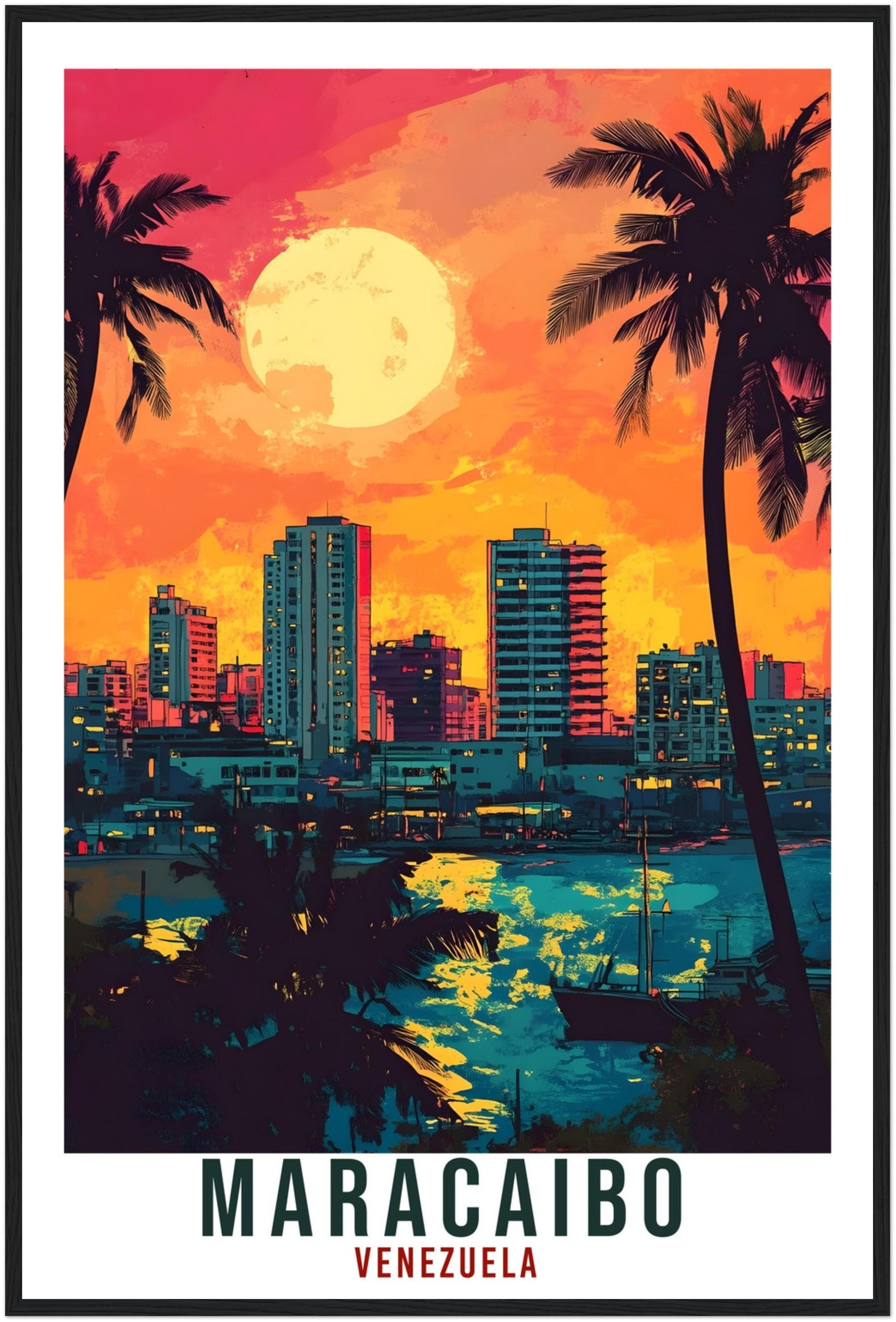 Transport yourself back to Maracaibo, Venezuela. Whether you lived there, visited there or are from there, travel back with this Maracaibo travel poster. Visit the sounds, smells, tastes, colors and culture every time you look at your new travel print. Each design is an imaginative recreation of the area to illicit memories of travelling there.