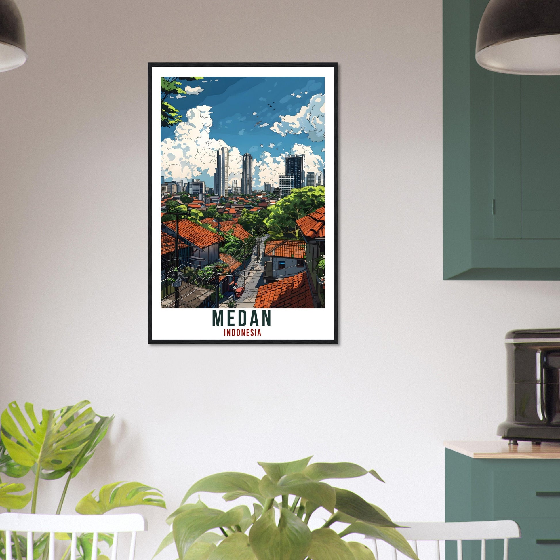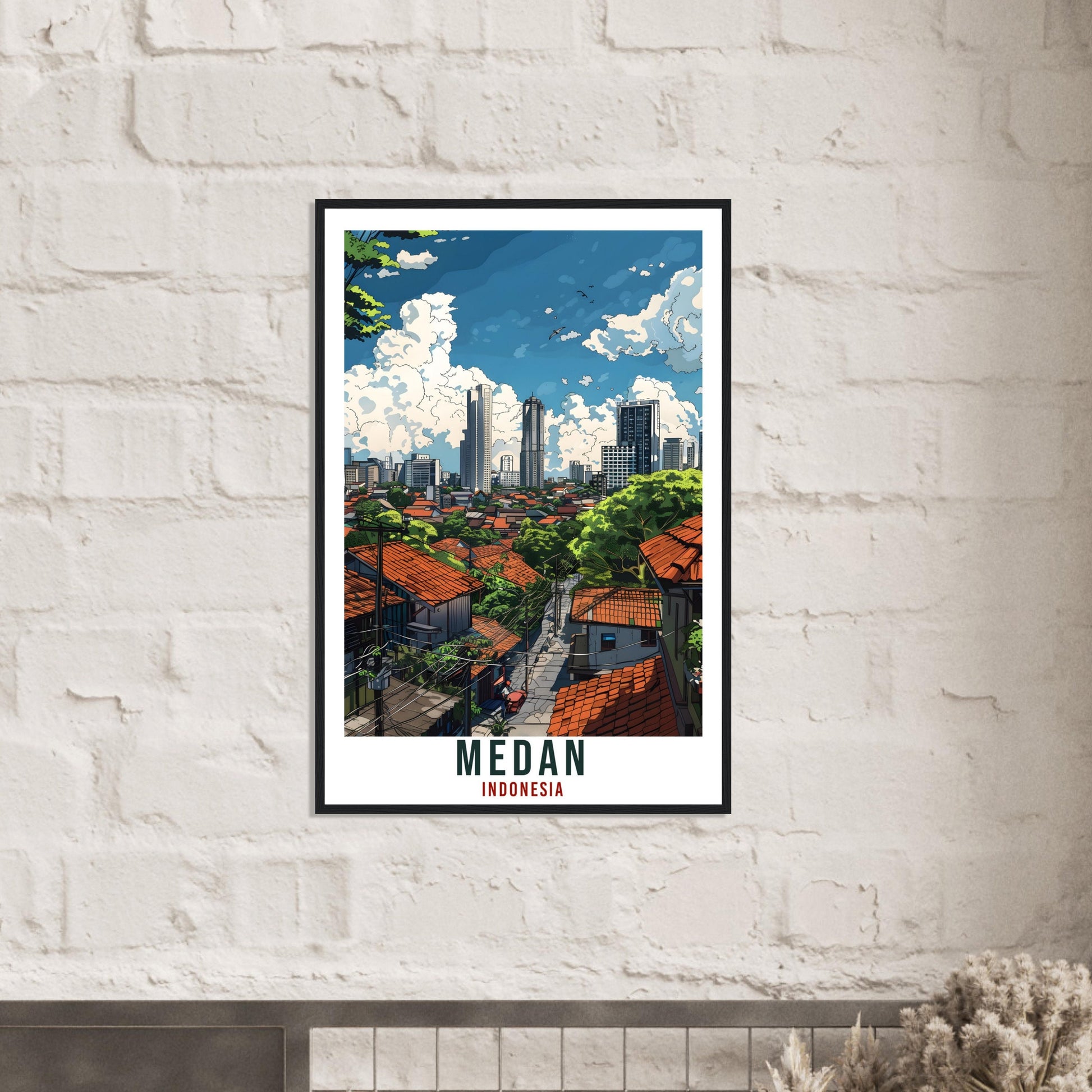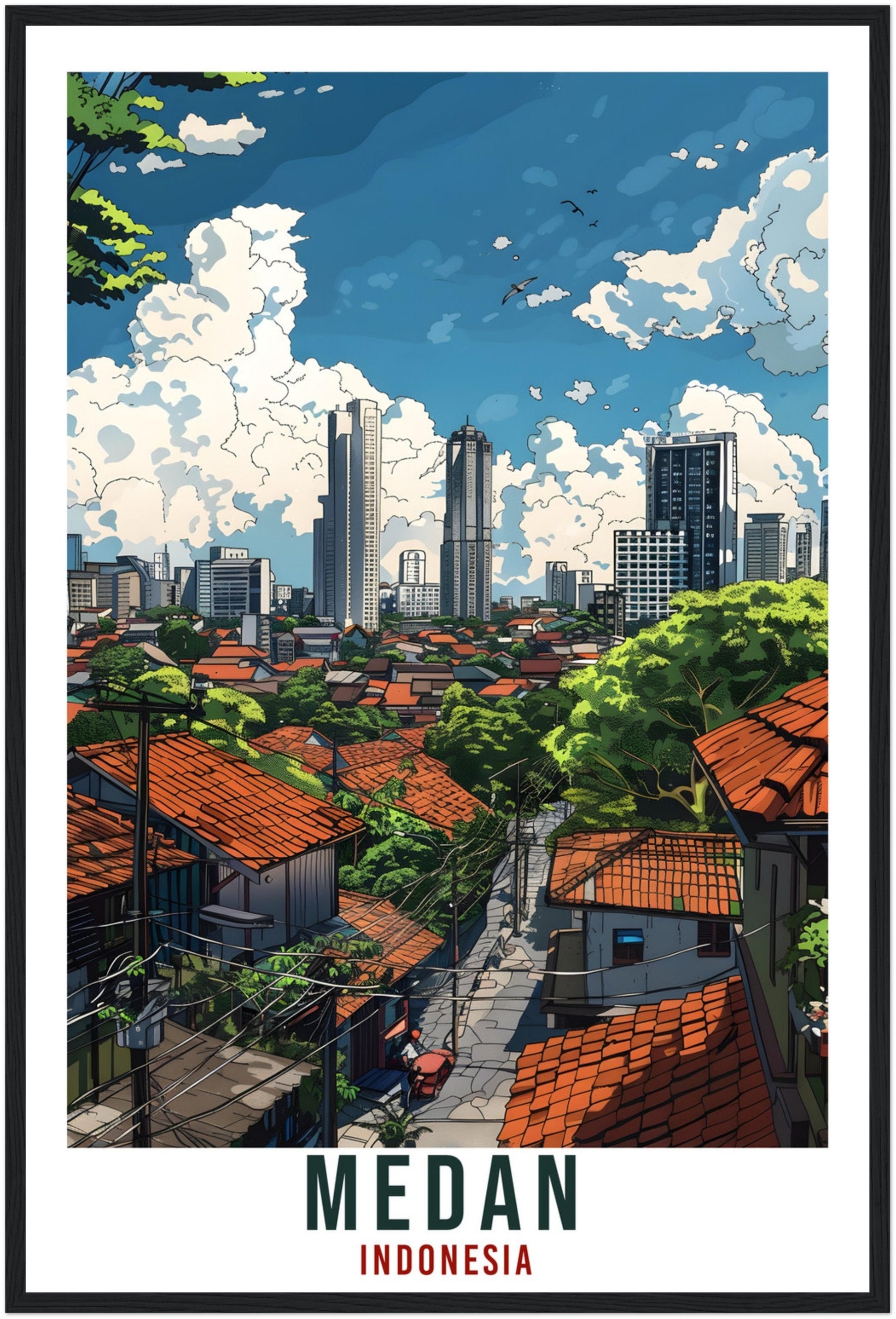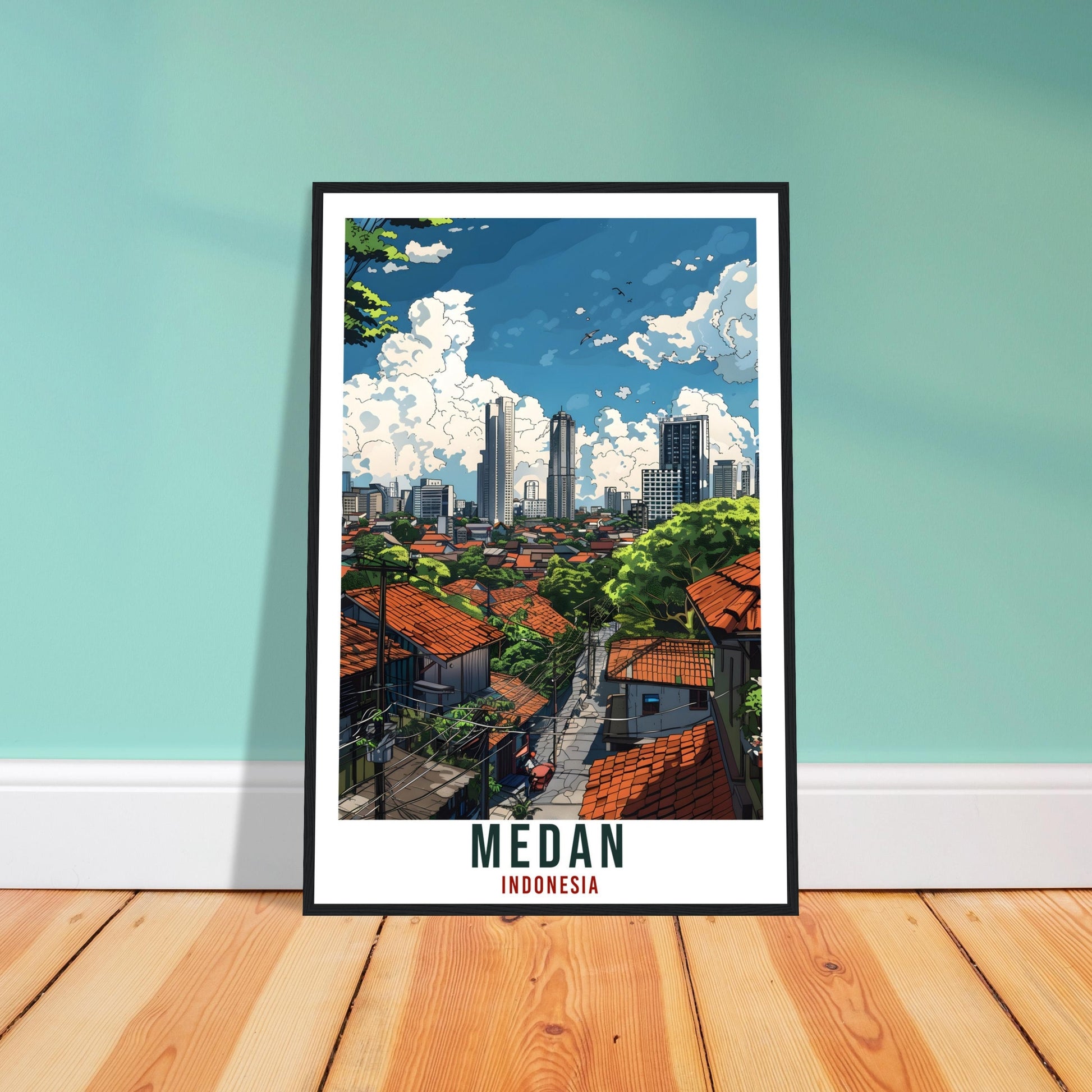 Transport yourself back to Medan, Indonesia. Whether you lived there, visited there or are from there, travel back with this Medan travel poster. Visit the sounds, smells, tastes, colors and culture every time you look at your new travel print. Each design is an imaginative recreation of the area to illicit memories of travelling there.