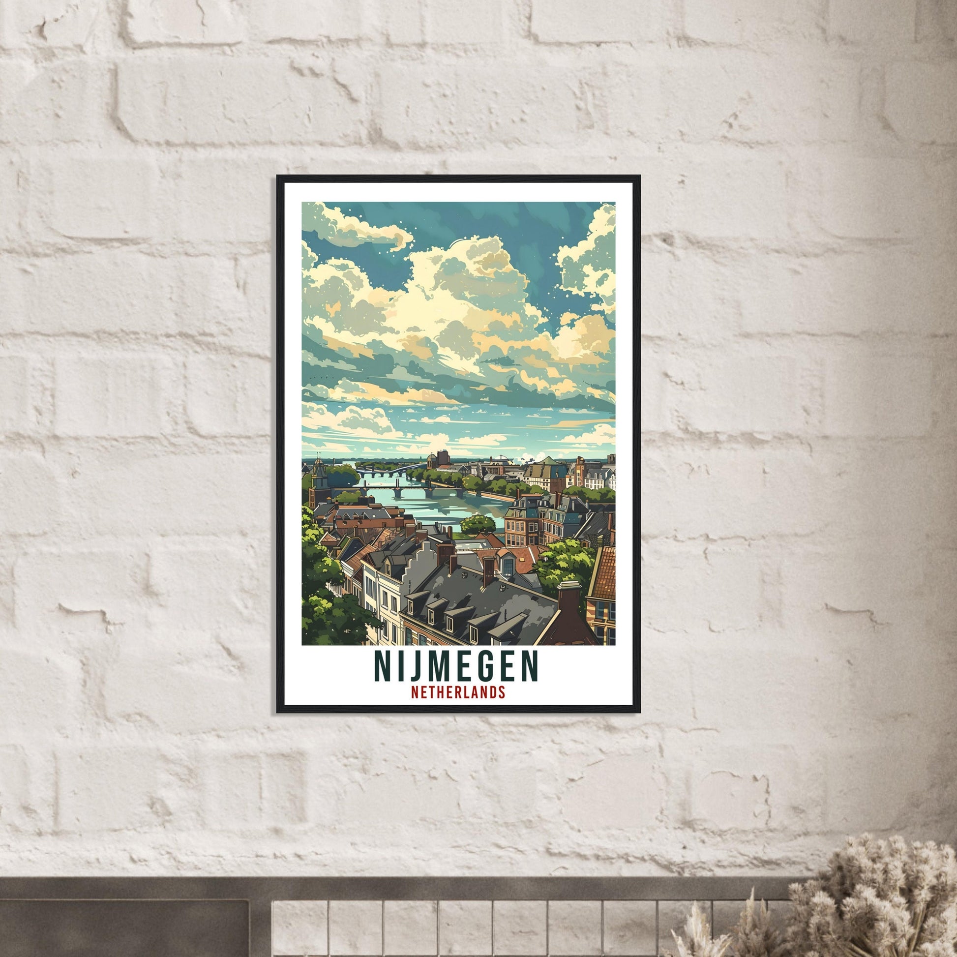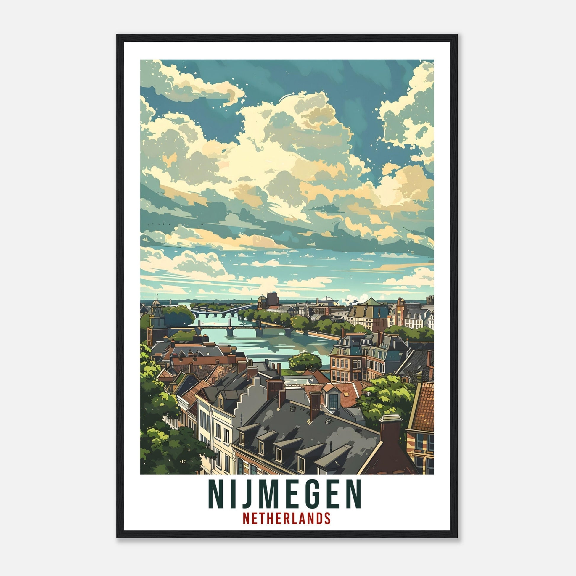 Transport yourself back to Nijmegen, Netherlands. Whether you lived there, visited there or are from there, travel back with this Nijmegen travel poster. Visit the sounds, smells, tastes, colors and culture every time you look at your new travel print.