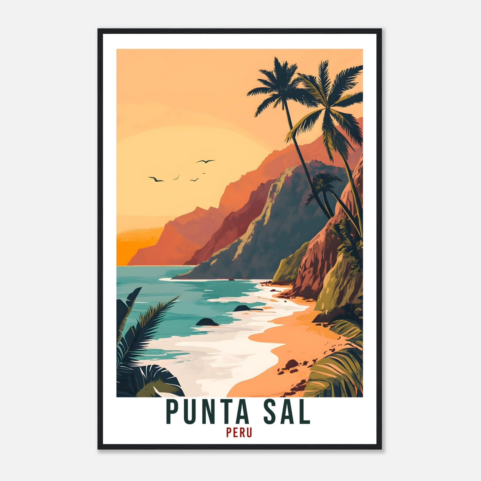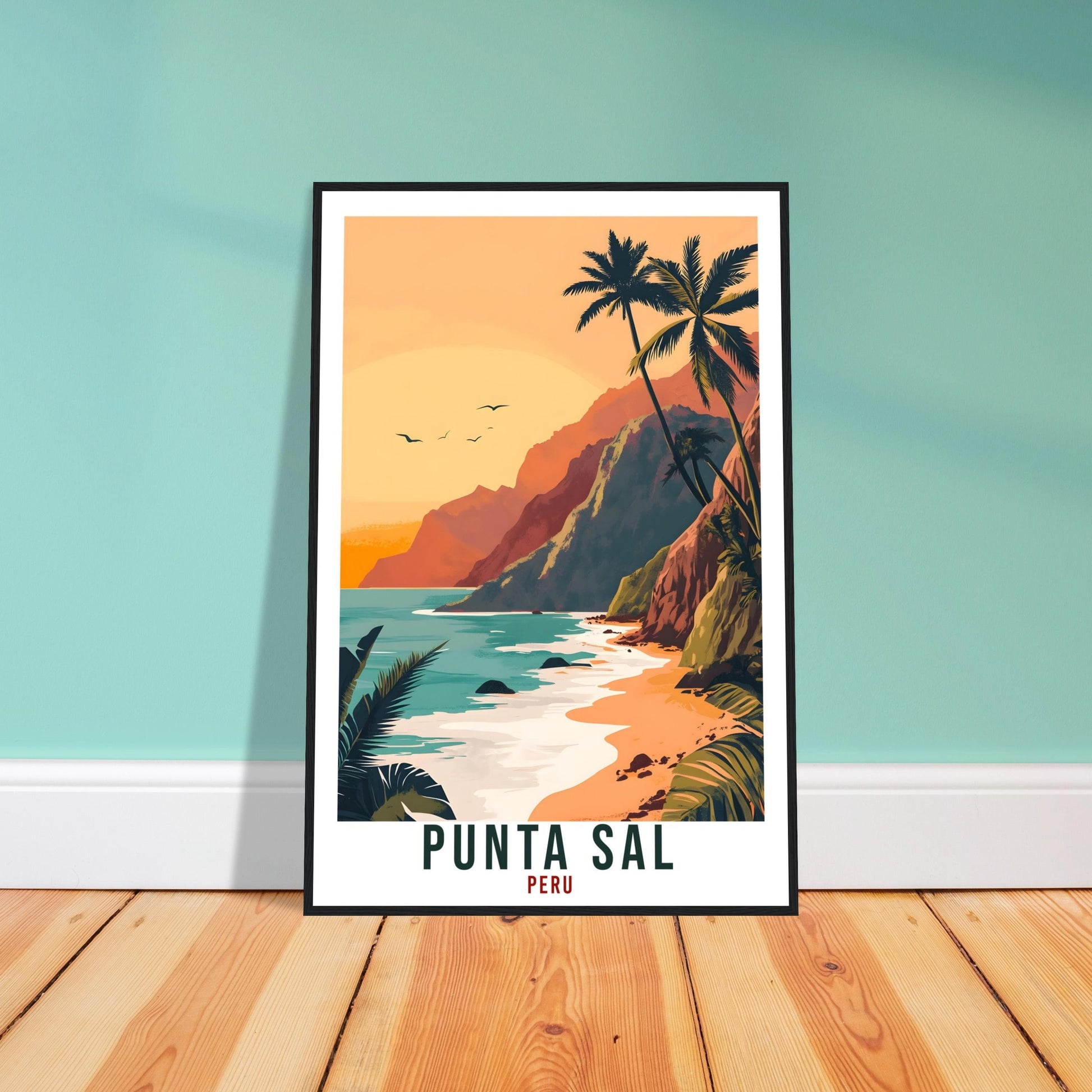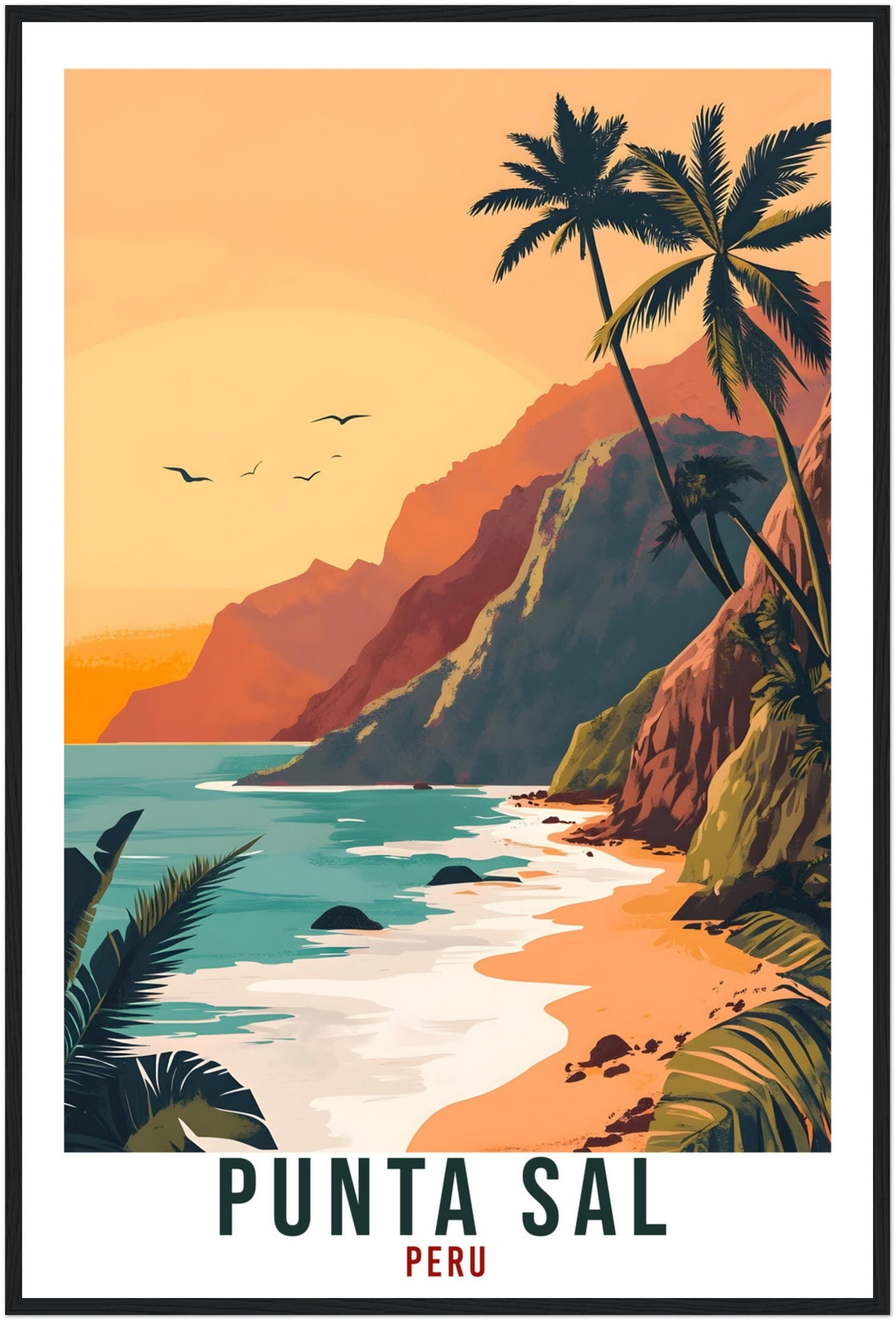Transport yourself back to Punta Sal, Peru. Whether you lived there, visited there or are from there, travel back with this Punta Sal travel poster. Visit the sounds, smells, tastes, colors and culture every time you look at your new travel print. Each design is an imaginative recreation of the area to illicit memories of travelling there.