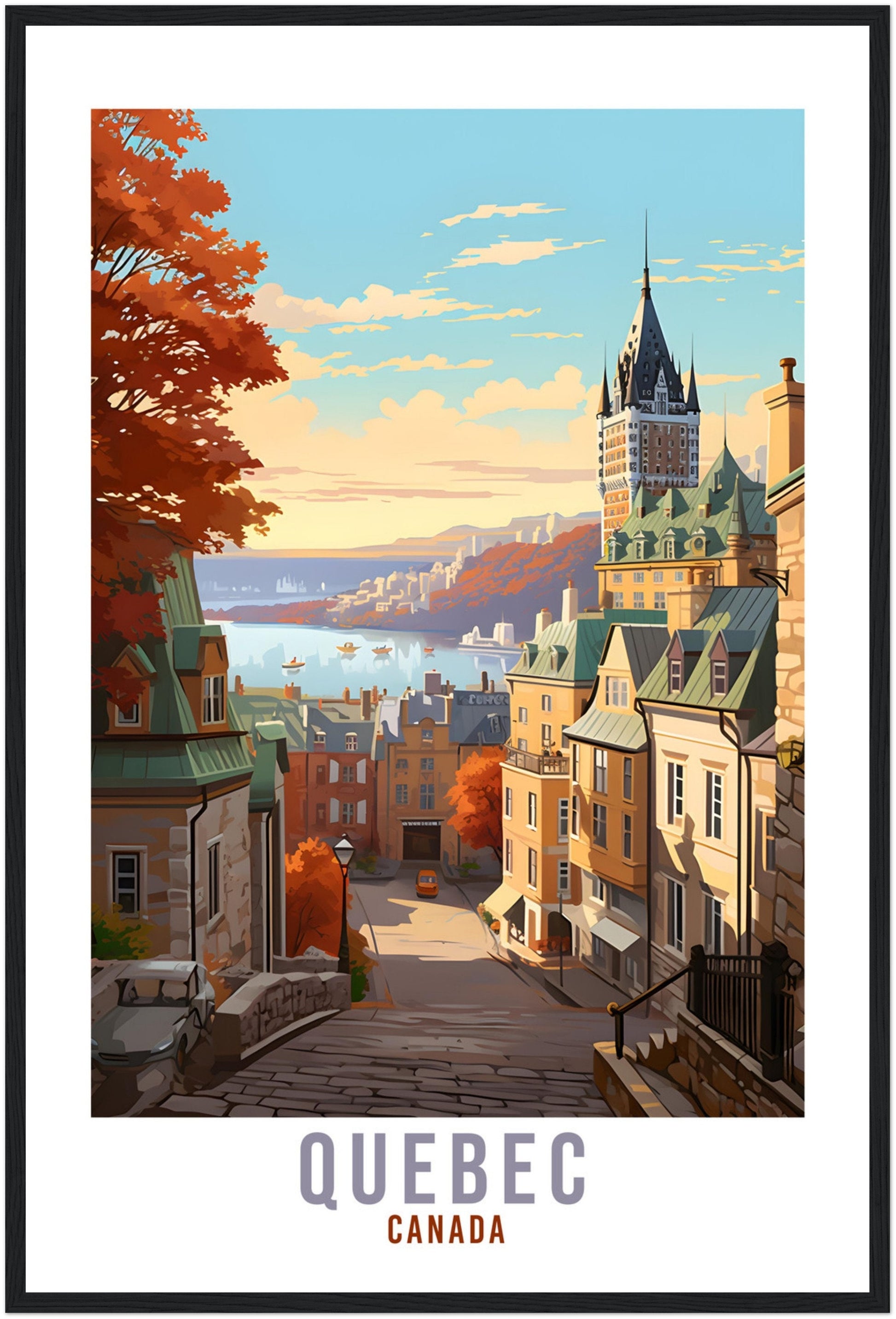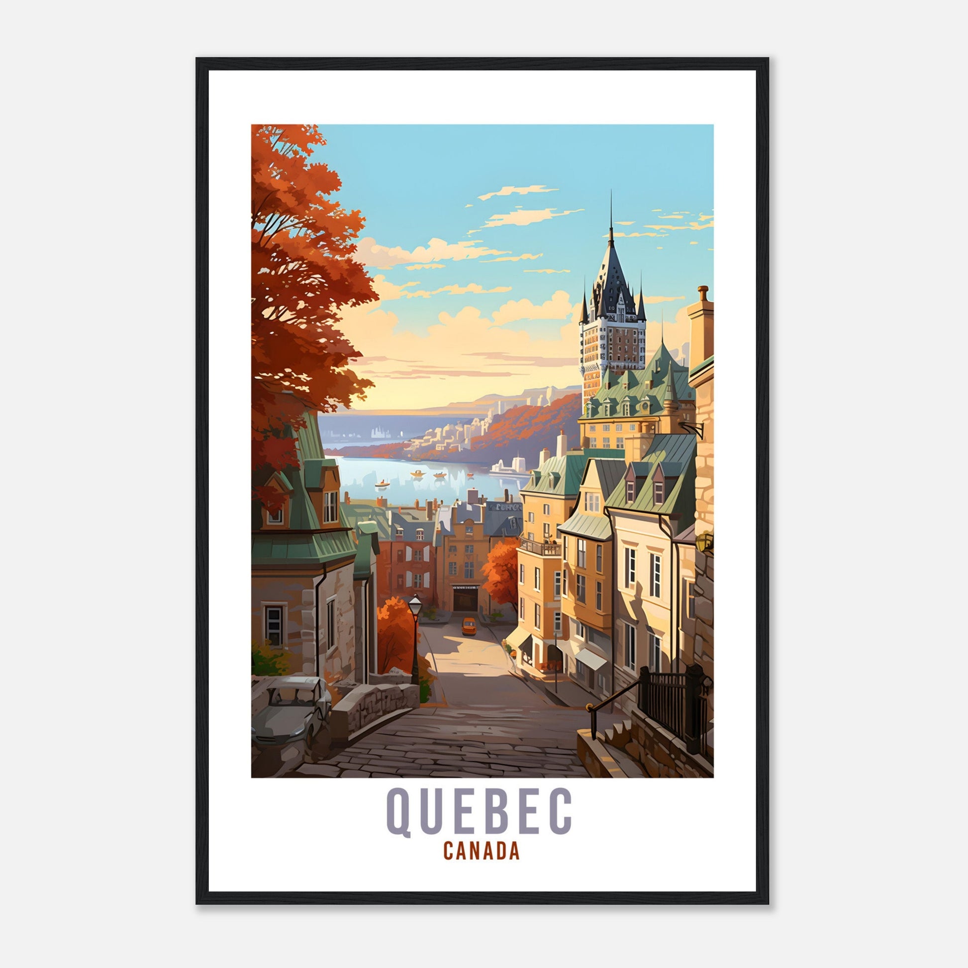 Transport yourself back to Quebec, Canada. Whether you lived there, visited there or are from there, travel back with this Quebec travel poster. Visit the sounds, smells, tastes, colors and culture every time you look at your new travel print.